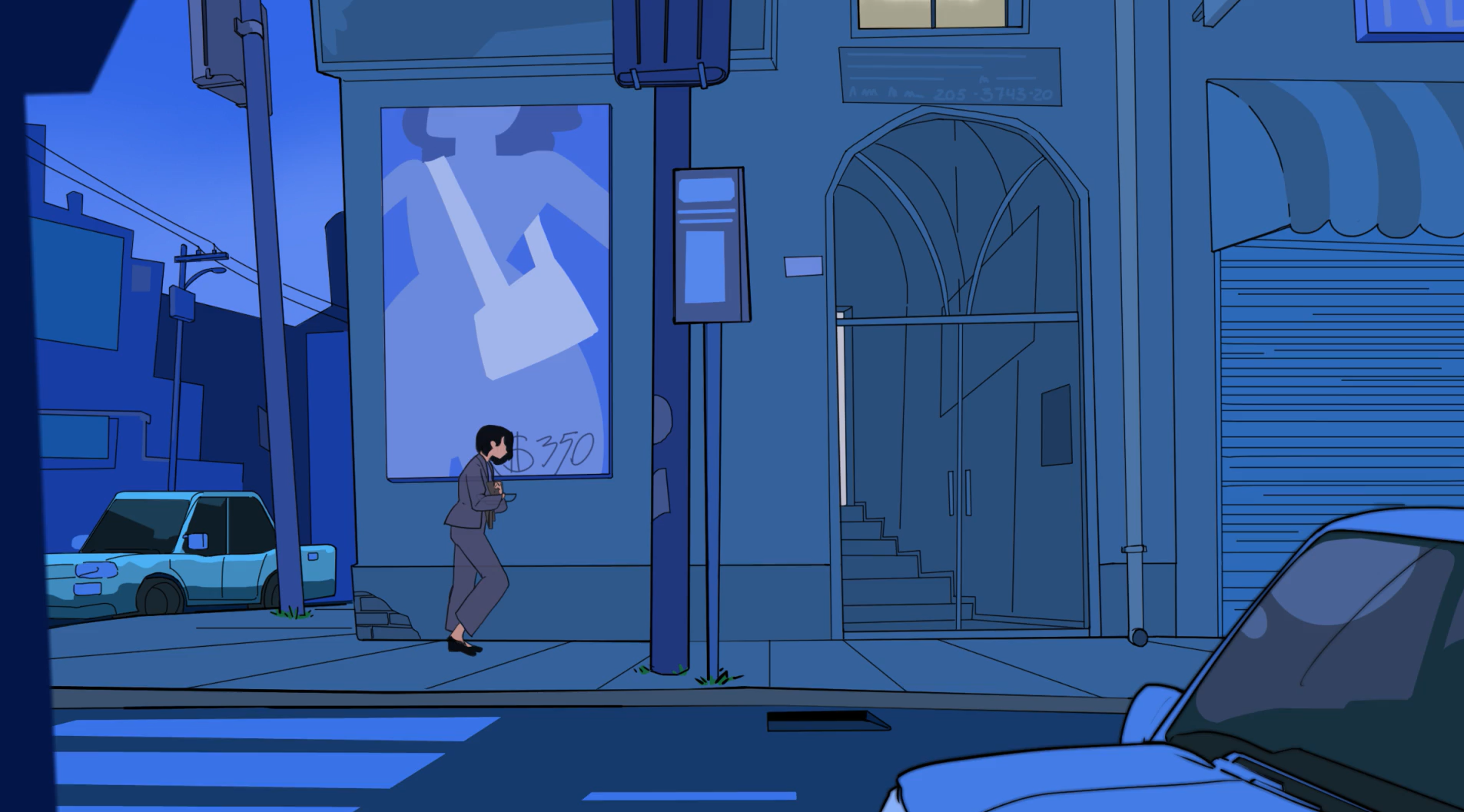 O roteiro representa momentos fragmentados da vida da personagem: a solidão na rua à noite, a insônia, a mesa de jantar silenciosa, a conversa com a mãe, a pressão no trabalho e, por fim, o momento decisivo em que ela encontra o caminho para buscar tratamento, com foco em sensações, não apenas ações. O movimento é lento, pesado, arrastado, refletindo o estado emocional da protagonista.