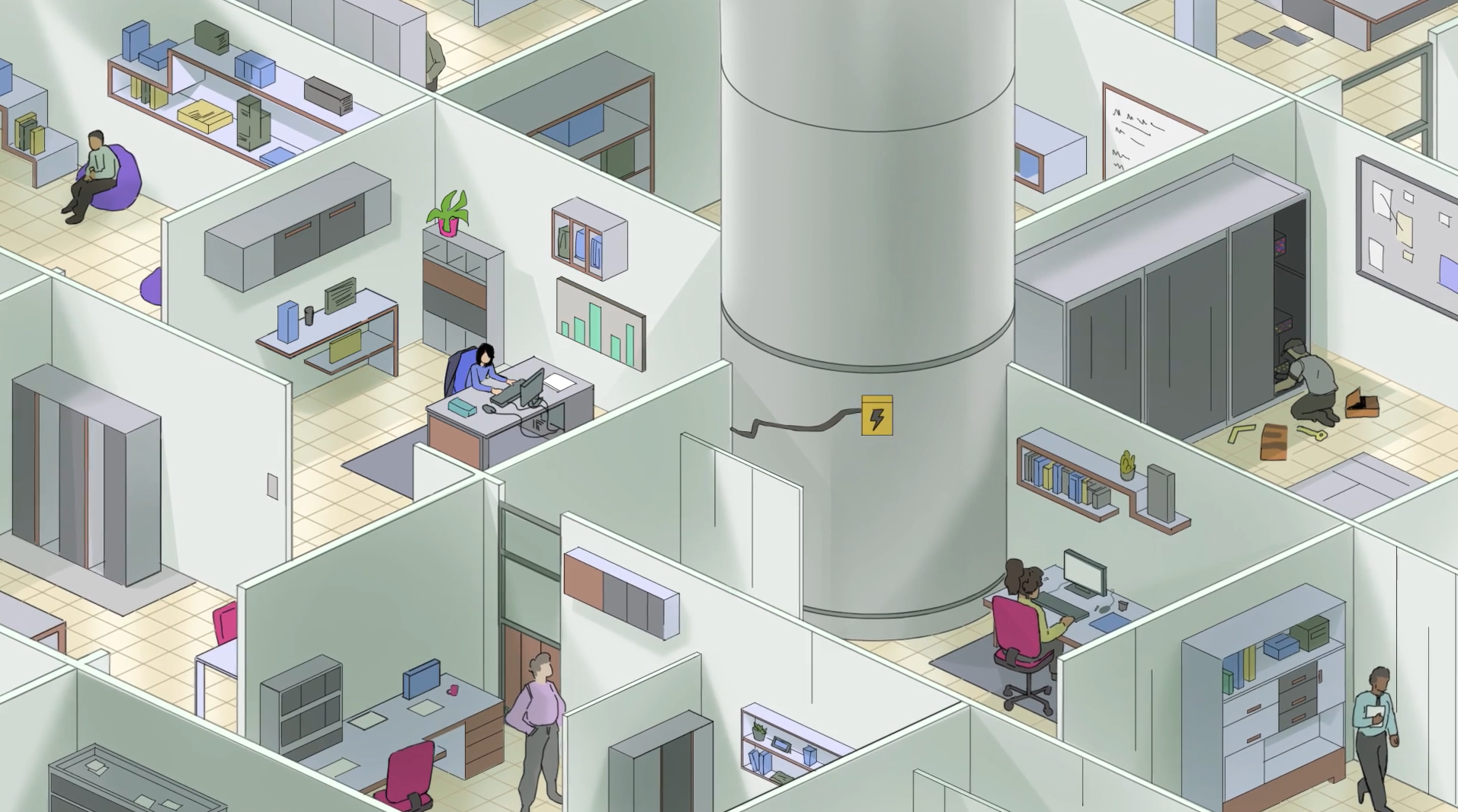O escritório, com seu “mar de cubículos”, é mais uma fonte de pressão do que de produtividade.